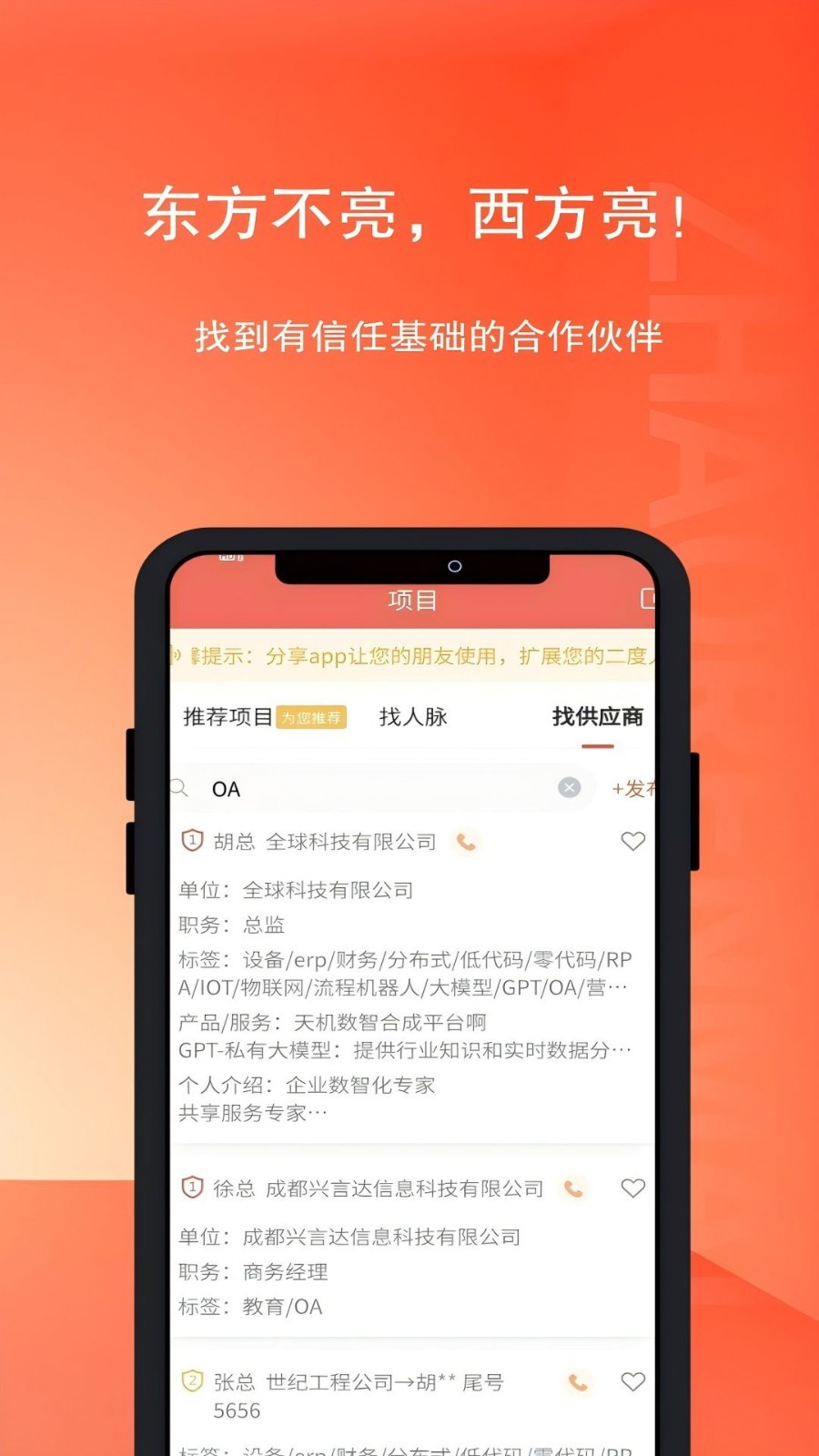 找人脉是一款高效的社交应用,帮助用户在职业发展中找到合适的合作伙伴和机会。它不仅可以提升职场人际关系,还能为用户提供更多的职业选择和发展空间。通过智能推荐和精细化管理,找人脉让社交变得更加简单和有价值,是每个职场人士必备的工具。更多精彩等您下载!