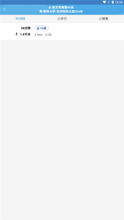 用户可以通过首页点击下面 “导乘”进入导乘查询页面。输入乘车起点站、终点站,点击搜索,进入查询结果页面,查询结果显示多种方案,有直达的。