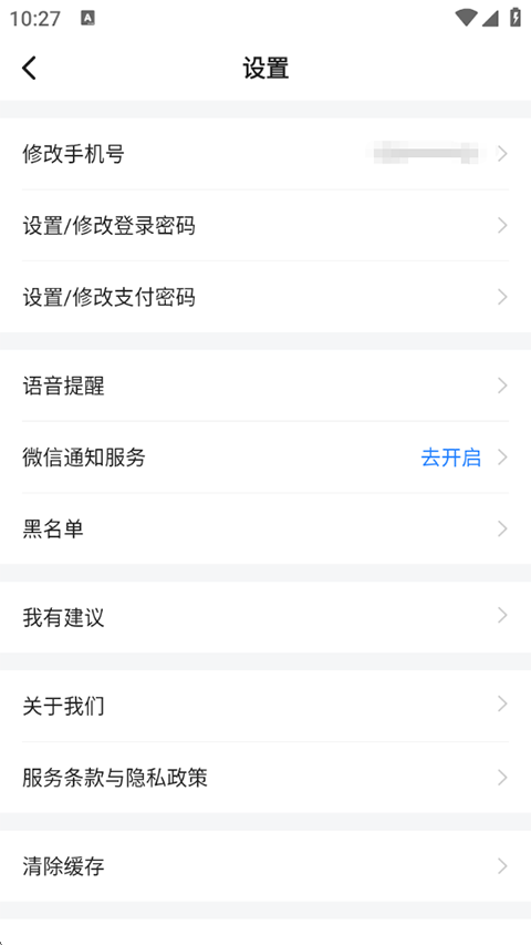 6、最后您可以在设置页面修改一些手机、登录密码、支付密码以及提醒功能和黑名单等私人服务。