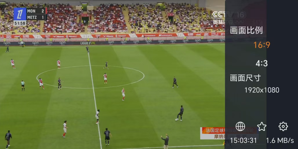 点击菜单键,我们看到可以切换画面比例16:9和4:3,画面尺寸是固定的高清无法选择,还有就是时间、观看网络速度,源链接、收藏和一个齿轮,点击齿轮是更多的设置。