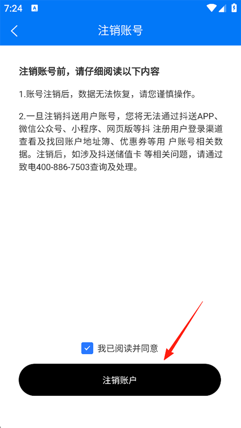 4、注销账号前阅读如下内容,确认无误后点击注销账户即可。