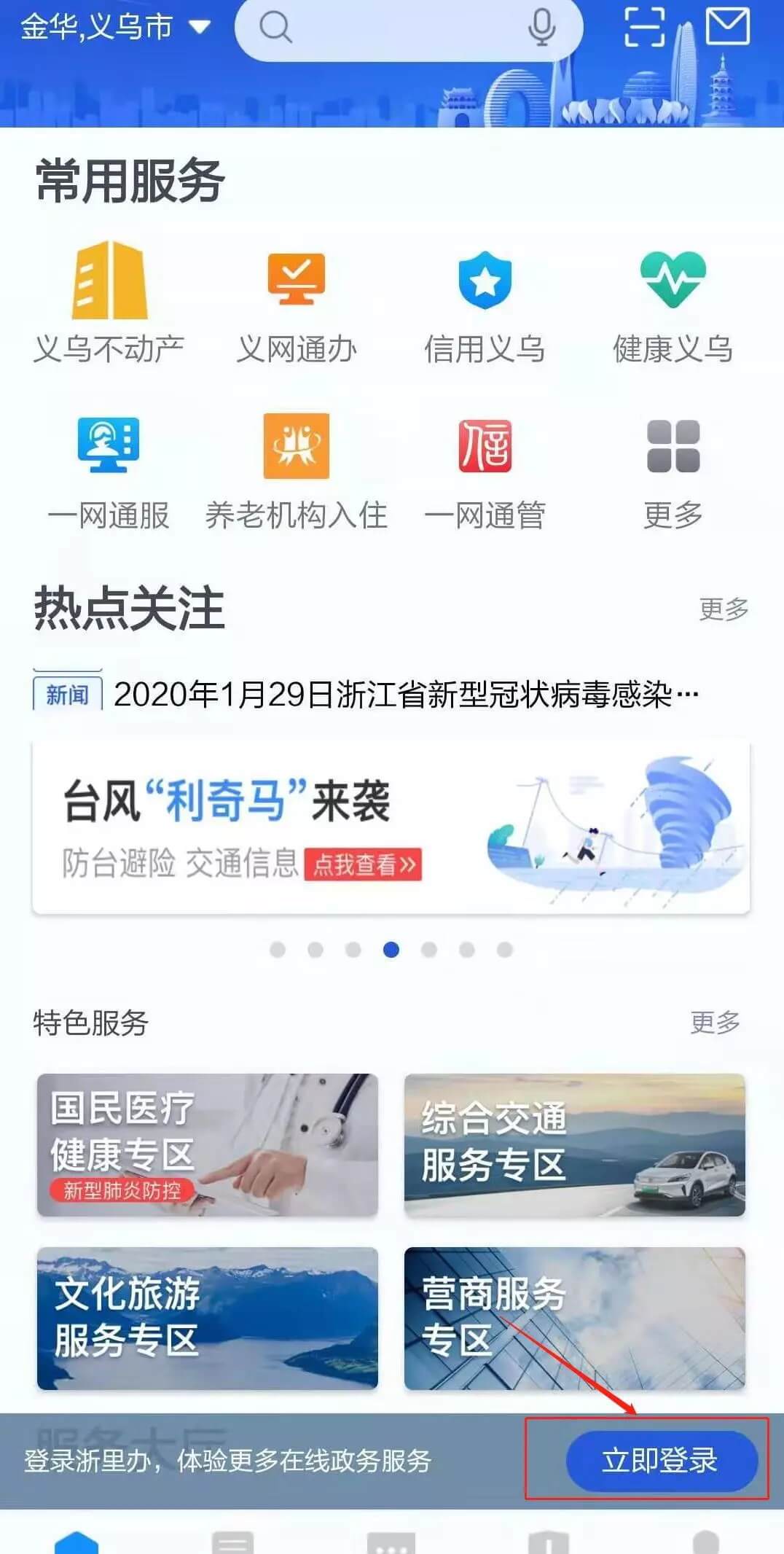 第 一 步 :下载并打开“浙里办”APP,点击页面下方的立即登录,输入用户名、密码进行登陆,没有账号的请注册后再操作。(账号同“浙江政务服务网”)。