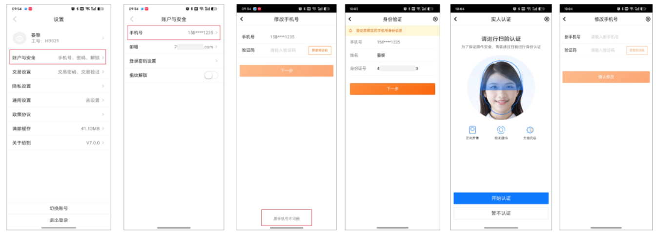 2、员工的原手机号可以登录,但无法收到验证码,且不再使用:在给到实名认证后修改,实名认证通过的流程如下。