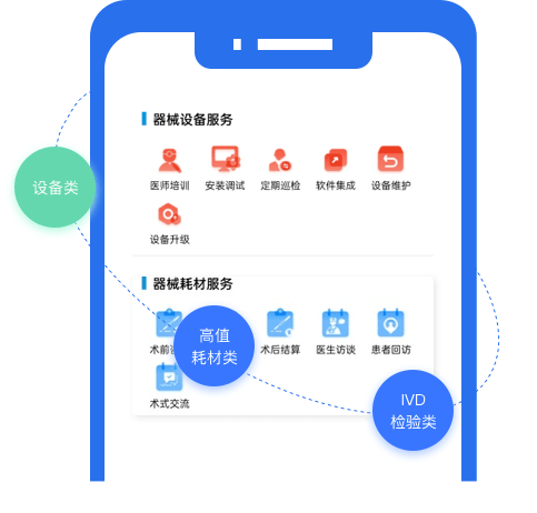 针对设备类、高值耗材类、IVD检验类行业特点,推广医疗器械专项维修与技术服务等服务管理。