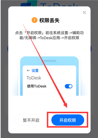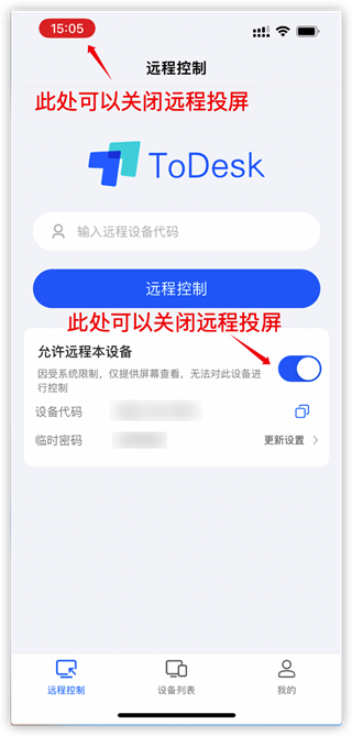 点击ToDesk选项右侧的开关,然后把它的开关打开,变成蓝色(如下图)。另一部手机就设置好了。