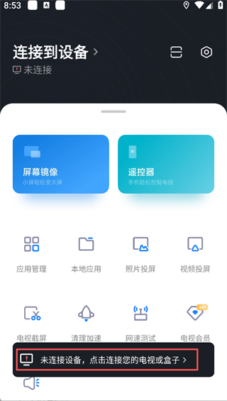 1、打开小米投屏神器App进入主界面,底部提示「未连接设备,点击连接您的电视或盒子」,点击即可进入设备搜索页面。