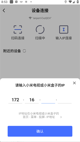 3、若自动搜索不到设备,可选择「输入 IP 连接」,在弹窗中填写电视 / 盒子的 IP 地址后点击确认完成连接。