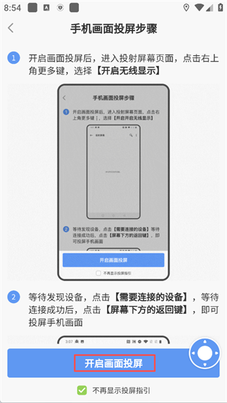 6、点击主界面「屏幕镜像」,可进入手机画面投屏指引页,按步骤开启无线显示,选择对应设备即可完成手机屏幕投屏。