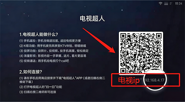 4、可在电视端的电视超人界面,找到电视 IP 地址,用于手机端手动输入连接,也可直接扫码快速配对。