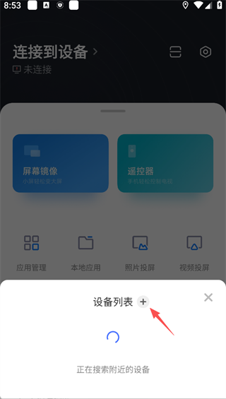 2、进入设备列表页后,小米投屏神器App会自动搜索同 WiFi 下的电视 / 盒子,也可点击「+」号手动添加设备。