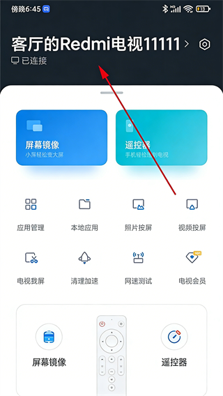 5、设备连接成功后,主界面顶部会显示已连接的电视名称,即可使用全部投屏 / 遥控功能。