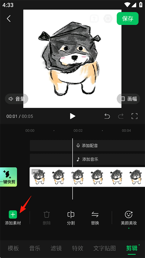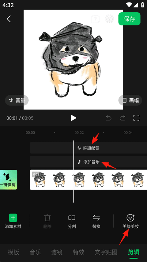 2、从本地导入视频素材后即可开始创作,如添加配音、音乐、美颜美妆等;