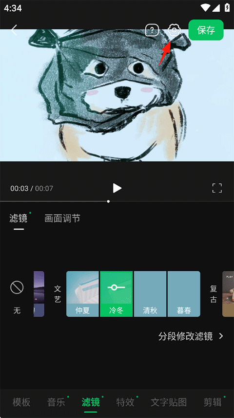 6、使用下方提供的工具将视频调整美化到满意后,点击右上角保存即可;