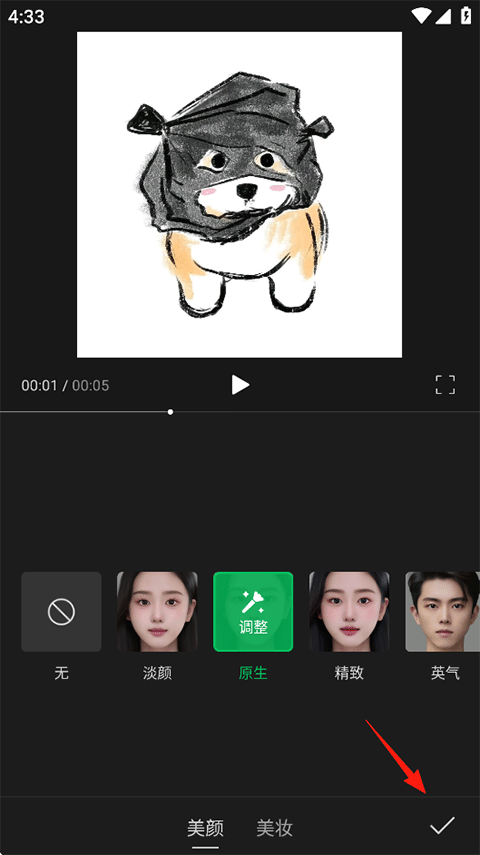3、选择一个适合的滤镜美颜效果,点击右下角的✓确定;