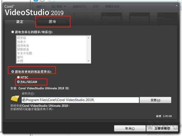 4:点击“选取所有使用的视讯标准”,点击“PAL/SECAM”。是否选择跟换安装位置,看自己个人习惯,直接安装到默认位置即可。选择好之后,先不要点击立即安装,点击“选项”。这里有个小暗舱需要注意一下。