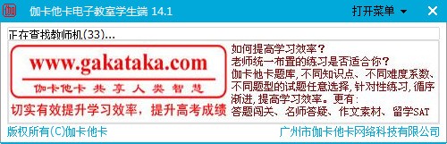 伽卡他卡电子教室学生端是一款由由伽卡他卡公司隆重推出的一款非常不错的电子教室网络课堂类软件。伽卡他卡电子教室学生端主要功能有考试系统(支持WORD试题和操作题),专门为教育打造的一款远程教学软件,帮助教师直接对接学生端,完美支持Win7/Win8 32位和64位操作系统。伽卡他卡电子教室内置P2P聊天、文件收发,远程关机重启、远程执行、黑名单、限制上网、课堂评价、随堂测试、教室分隔、远程重启非常全面的功能,使用方便,无人数时间限制,够实现师生之间的课堂互动,更有答题闯关、名师答疑、作文素材、留学SAT等功能,欢迎有需要的用户前来获取!