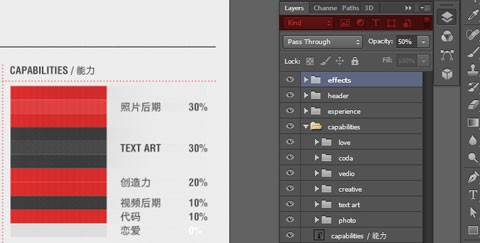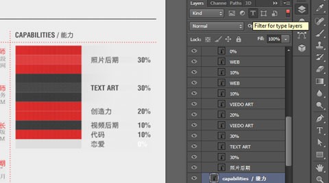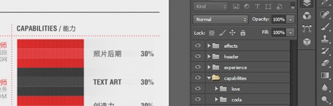就拿截图举例,这是简历,当我需要更改一下 Capabilities 这一个组的文字的时候,或者我需要批量选取他们,微调一下位置,我该怎么办呢?把组展开,然后按住 Ctrl 用鼠标一个一个点?是的,在以前的版本里我们只能这样做,不过,这在 CS6 里边将会变得异常简单,「图层面板」多了一个筛选功能,它可以按照「Kind(类型)」, 「Name(名称)」, 「Effect(效果)」, 「Mode(模式)」, 「Attribute(属性)」 ,「Color(颜色)」这些来筛选显示的图层。