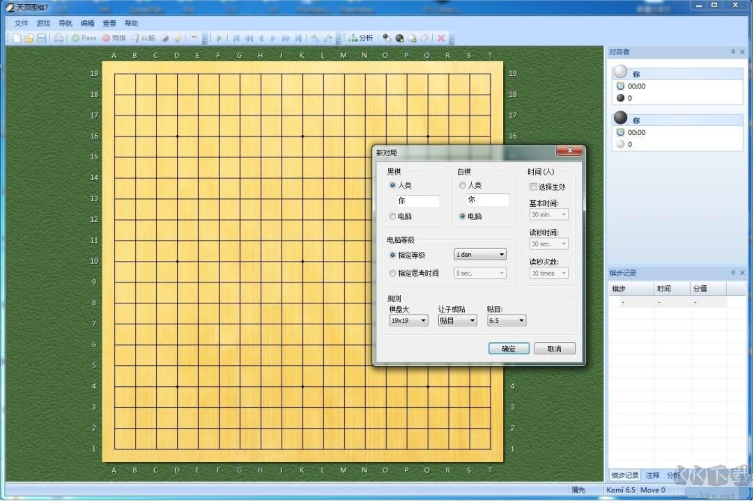(4)支持多种棋盘大小(9路至19路),可设置引擎强度、让子、贴目等,并可保存为自己的默认设置。