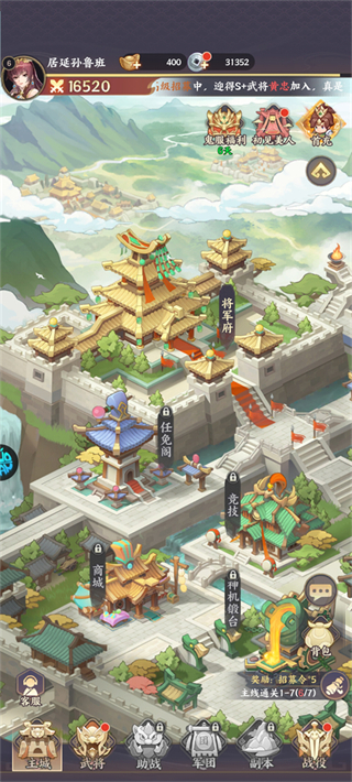 主城是你的大本营,解锁更多建筑(如将军府、任免阁)后,能开启养成、竞技等更多玩法,提升你的综合实力。