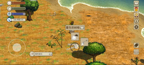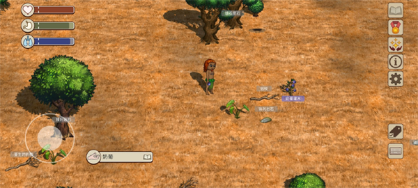 打开右下角标签功能,部分动植物的名称就会显示。名称的背景有灰色和紫色两种。灰色背景道具为一般的道具,可以捡起手持;紫色背景的道具交互后会产生新的道具,如有果实的果树、有蛋的鸟巢都是紫色背景可交互,交互完成后可以得到能食用的果实和蛋。