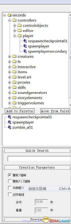 来个最简单的,选择左边的小箱子添加物品,一个引入玩家点 spawnplayer,一个复活点respawncheckpointa01,一个僵尸zombie_a01: