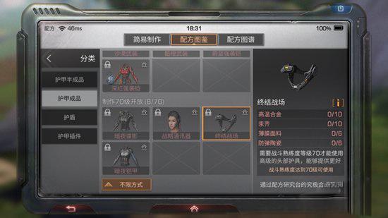 要制作终结战场需要制作配方:高温合金10个、汞齐10个、薄膜面料6个、防弹陶瓷6个。