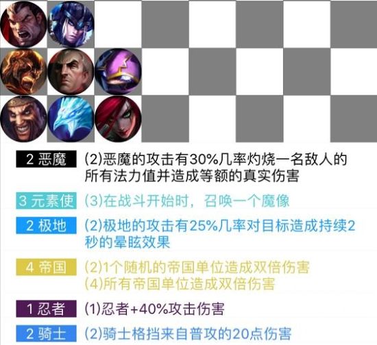 阵容解析:前期选择优质的二级打工棋子(卡萨丁、豹女、狼人等)进行过度,到6级后逐步更换组件。帝国要等凑齐四个再一起上,之前只用诺手和德莱文。