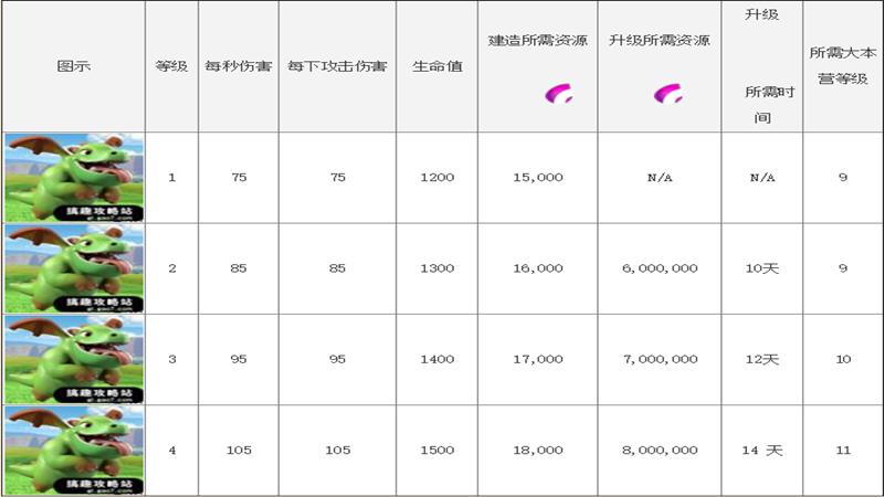 部落冲突里的飞龙宝宝是非常可爱的一个兵种,凭借着呆萌呆萌的形象深受玩家们的喜爱,现在带给大家部落冲突里飞龙宝宝升级所需要的数据噢。