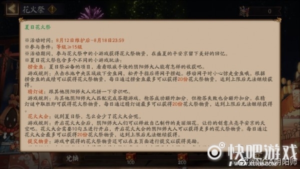 *活动期间,参与花火祭中的小游戏获得花火祭物资,在盛夏的平安京留下美好的回忆。