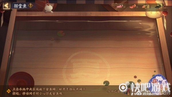 点击水池中央区域放下金鱼网,松开手指后将网子捞起。