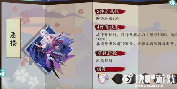 4件套效果:战斗开始时,获得恶楼之力(增伤100%、减伤100%)。在携带者的前10回合,恶楼之力暂时被封禁。