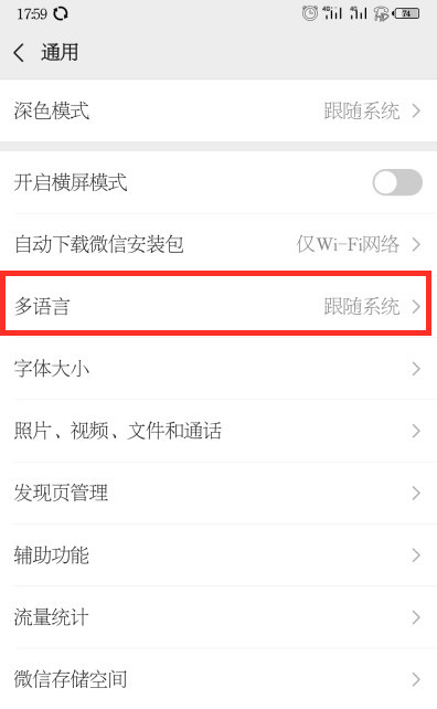 4、在通用设置页面中选择多语言进入语音设置页面。