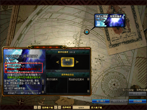 4、角色一直向左走,进入传送门中,根据自己的角色等级选择进入的地下城的等级情况,进入地下城所需材料都是五个无尽的永恒。