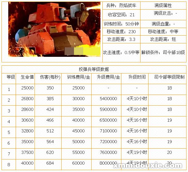 海岛奇兵烈焰战车升级时间资源详细数据