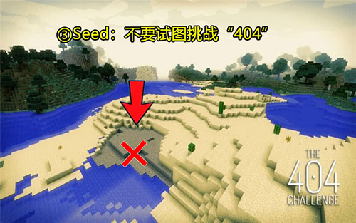 Seed:不要试图挑战“404”;404最早火爆于网络,是因为它有一块塌陷的沙砾地形。而然随后地图生成变更,404被终结。但随后一个叫做Herobrine的论坛管理员对玩家发出警告,当试图查看这位管理员信息时,页面出现了“404错误”。故此404再度火热起来。人们试图在这里寻找Him。