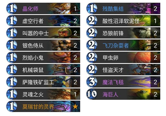 可以看到这便是一套以魔法飞毯为核心并在目前十分流行的术士快攻卡组。其中的一费随从竟然有13张,算上怪盗天才拿到跟班的甚至多达17张一费随从。术士拥有虚空行者,烈焰小鬼这两张契合飞毯的生物。飞毯提供的突袭效果与叫嚣和恐狼配合起来迅速解场。场面逐回合不断扩大的同时再加上术士特有的残酷集结、怪盗天才与虫卵的配合,铺场buff一气呵成,及时拍下海巨人压场锁定胜局。虽然飞毯不能作为一张决胜卡出现在这套牌中,但他的作用无可替代,定时一张能与飞刀火蛇(旧)叫板的快攻神卡!