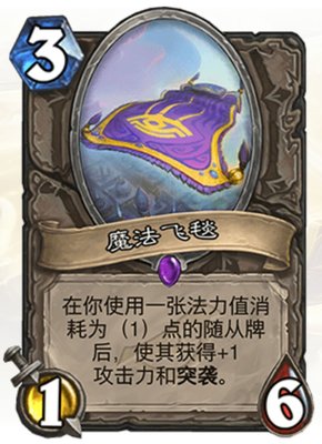 二、实战分析三费六血的身材,给友方随从一个看似十分鸡肋的buff效果,仅一费卡生效的描述更是有些刺眼。但这张卡的实战发挥并不是我们想的那样。作为一张中立卡牌,各大快攻职业的一费强力生物都有不小的发挥空间。暗影降临新推出的四种跟班更是飞毯的好搭档。被加上了buff的监工,银色侍从更是堪比三费生物。飞毯的强大更在于他的血量和突袭效果,六血的它甚至比同为三费的青铜门卫还多一血。