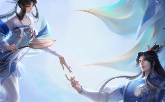 【总体设计】以蓝白为主体色,融入鹊鸟的元素设计,首次将汉服元素与王者的美术风格进行了结合!更有十三余如梦令同款实体汉服,线上线下共穿情侣装~