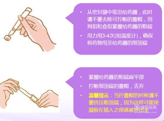 甩:用力把黄体酮凝胶从塑料给药器粗的一端甩到细的一端。甩3~4下即可。(注意:如果凝胶已达到给药器的细顶端,则不必再甩给药器,直接上药即可。)