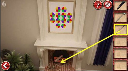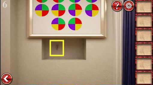 8、把彩色圆盘拼在左边墙壁壁画空缺处,调整成壁炉上方一样的图案,拿到钥匙,开门过关。
