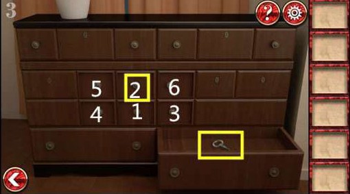 6、把把手和胶水组合在一起安在2号柜子上,按照上图数字顺序点击柜子,拿到钥匙,开门过关。