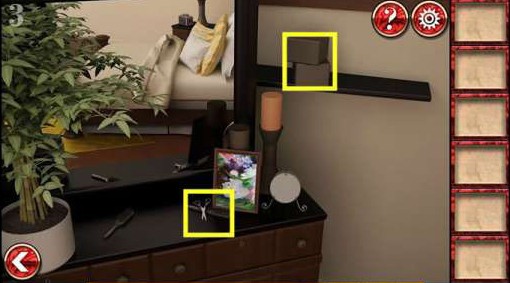 1、首先来到左上角的梳妆台处收集剪刀,还有盒子后面的胶水