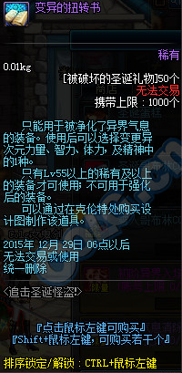 参加dnf2015追击圣诞怪盗活动,收集到50个被破坏的圣诞礼物就可以去兑换变异的扭转书了。