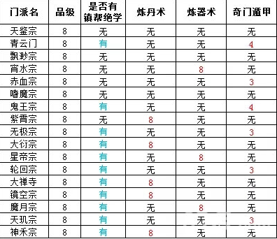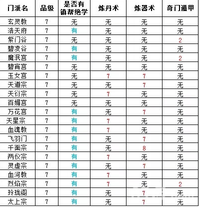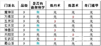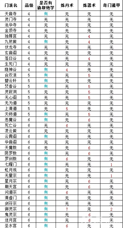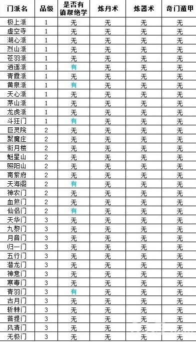 在表中,显示“无”则代表该门派没有炼丹师长老,无法学习到炼丹术