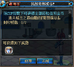 2、接收每日任务: LV25级玩家在诺顿处可以接取每日任务“挑战南部溪谷”:收集两个封印钥匙(通关南部溪谷的奖励),可获得10万金币罐一个。