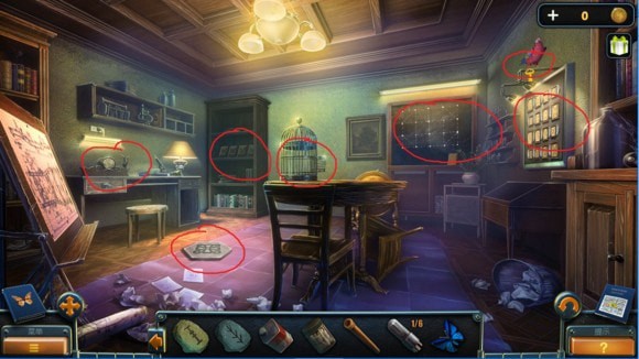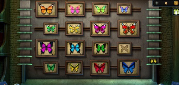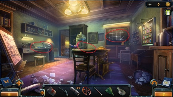 63、出大门,把水龙软管接在消防栓上,把水灌进窨井得到包裹,割开包包裹,得到蝴蝶、方块。回图书馆,进一娄房间,安方块,玩游戏,得得到黄色钥匙9号。二楼开门。看到幽灵。看书桌上的台钟,缺一个雕像,安前面捡到的雕像,得灯泡、圆形符块;书柜的四个蝴蝶标本要提示;地上的六边形地砖捡起;笼子开着;鹦鹉有钥匙,要想办法引诱它;墙上的蝴蝶标本架缺蝴蝶。黑板上差粉笔。