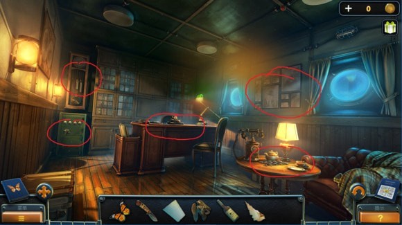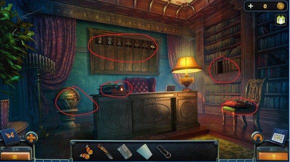 39、查看办公室,保险柜要密码;挂钟缺一个钟摆;点办公桌,捡蝴蝶;看小圆桌,得桅杆。,点墙壁,得帆船模型图片。