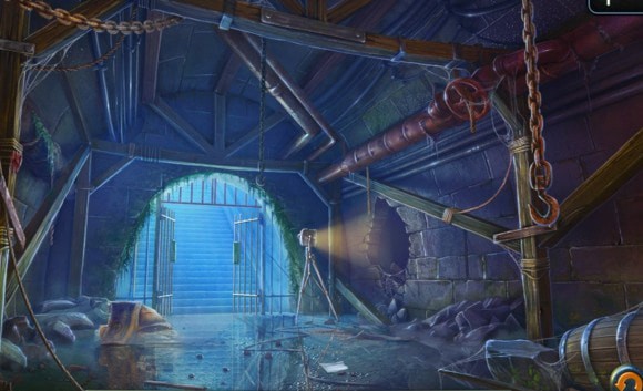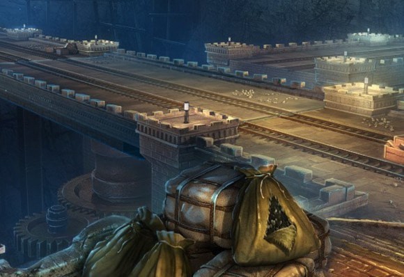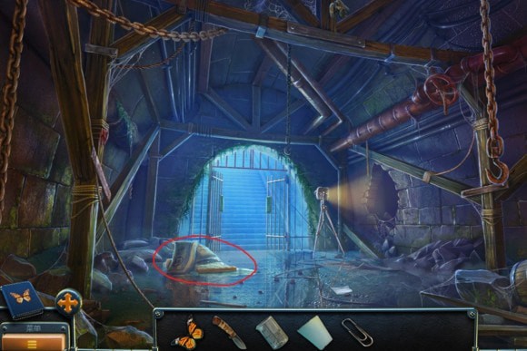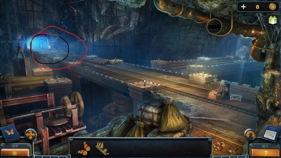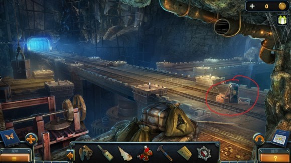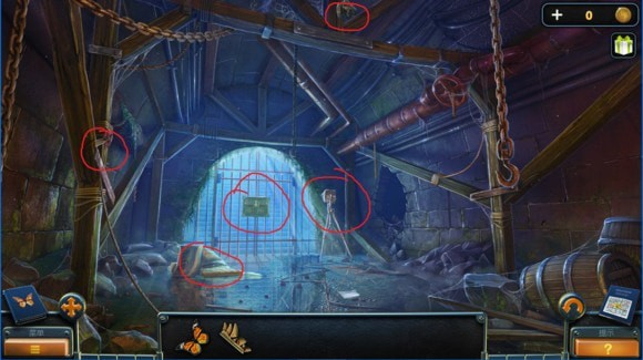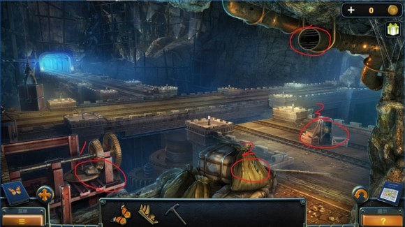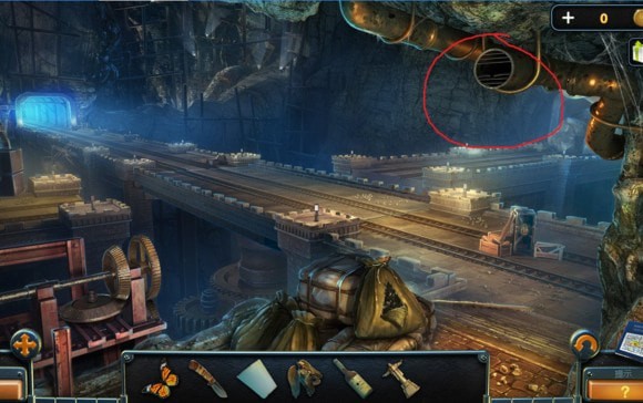8、点1所示的位置,发现有石头卡住,用镐砸碎石头,桥梁转动;点麻袋发现有东西但撕不开;点地上的柜子,发现少一块;点头顶上的管道,太深拿不到。桥梁去对面。