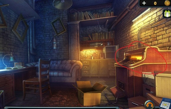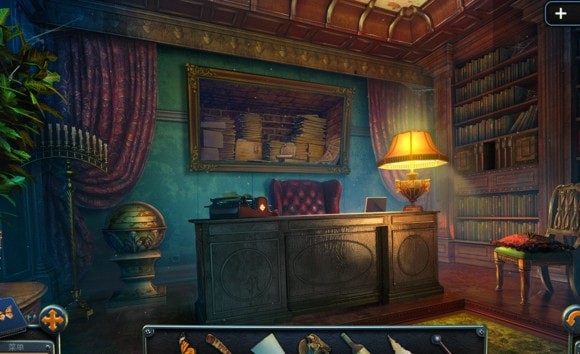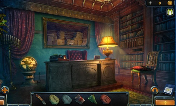 12、看电影,得知刚才一切都是黄衣老头和他的秘密组织的测试,试用期合格,黄衣老头递来一个烧杯,要记者拿去装失踪案件地的绿溶液来研究(汗,自己怎么不去,专爱指使人)。查看留声机发现还能用;去房间,地球仪没有插头;墙上的模型需要找齐;书架上差两本书;刀割开椅子座垫得到自由女神象(这真是个藏东西的好地方,也不怕硌PP)。打字机旁边有记者的身份份和照片,打字记夹着一张纸,但缺滚动转筒拿不了。出门。