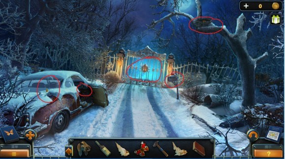 43、大门。点汽车,得小金鱼、天线、;进驾驶室,车窗上关着一张绝版,要把手才能升起来;查看邮箱,捡小金鱼,打开邮箱还差一个按键;树上鸟窝有东西但够不着。大门左侧路灯,点一下,用天线拿到钥匙,开大门进去。